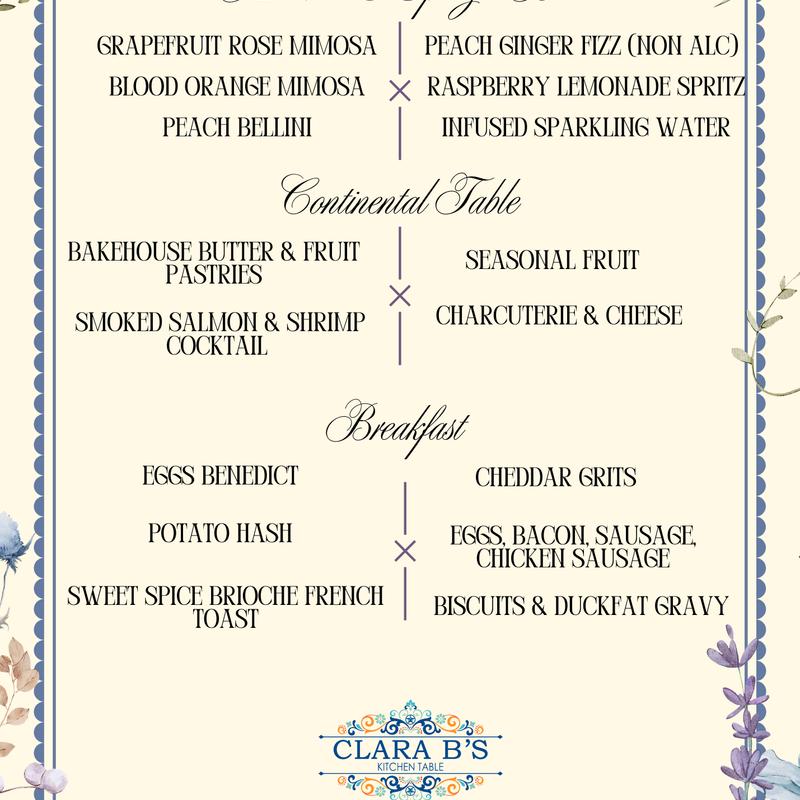 This is how Clara B’s celebrates the women who raised us. Featuring Classic and Continental Brunch Favorites, A Mimosa & Spritzer Bar, and Sweet Offerings from the Bakehouse